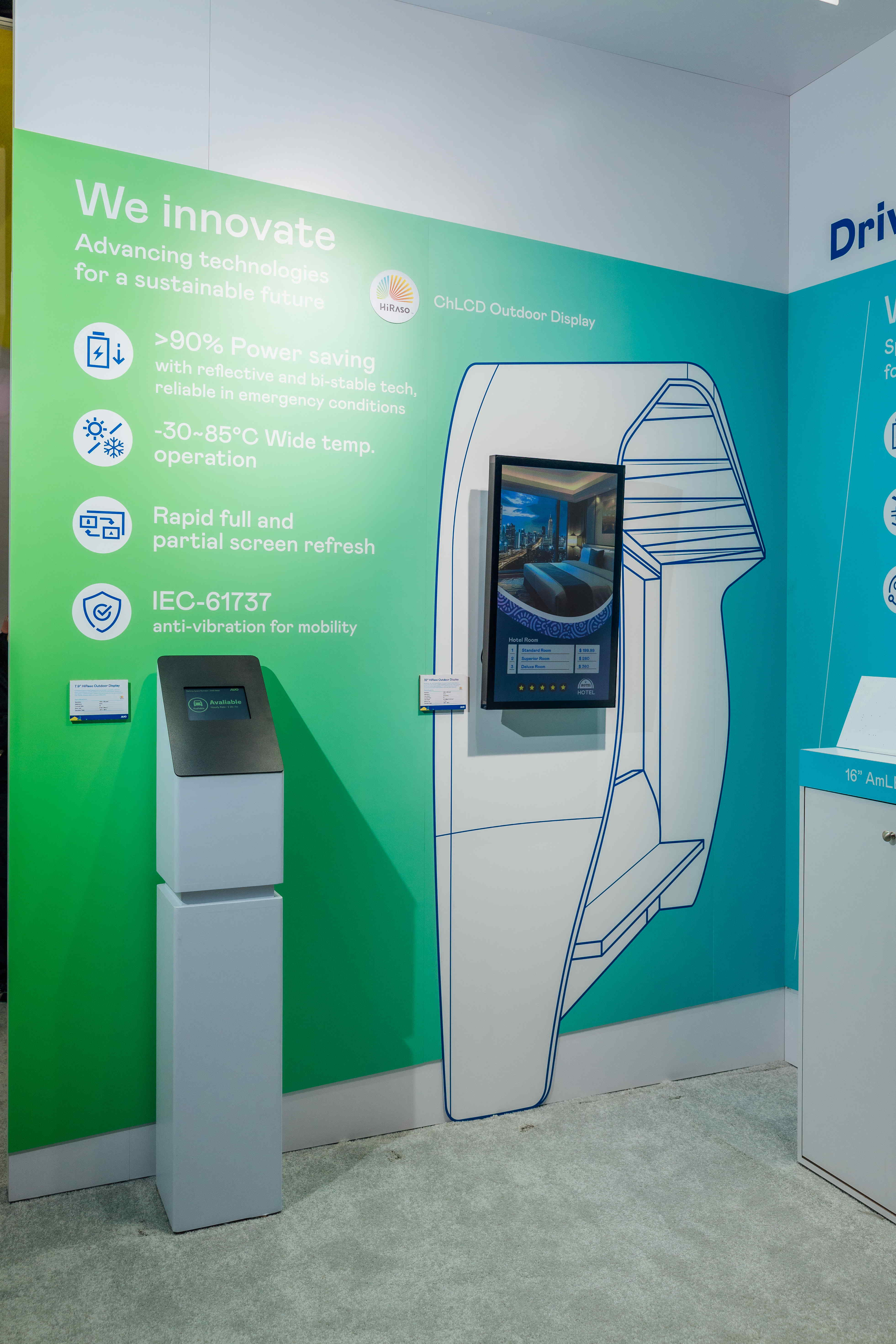 HiRaso胆固醇液晶显示器运用反射环境光线的方式,呈现影像显示时零耗能的环保省电诉求,光线愈强愈能呈现绝佳的色彩饱和度及显示效果,同时在摄氏-30度至85度间宽温的使用优势,为户外电子看板的新首选。